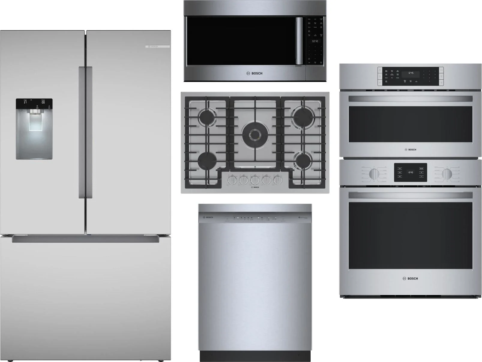 Bosch 5 Piece Package Includes Refrigerator, Cooktop, Wall Oven, Microwave And Dishwasher