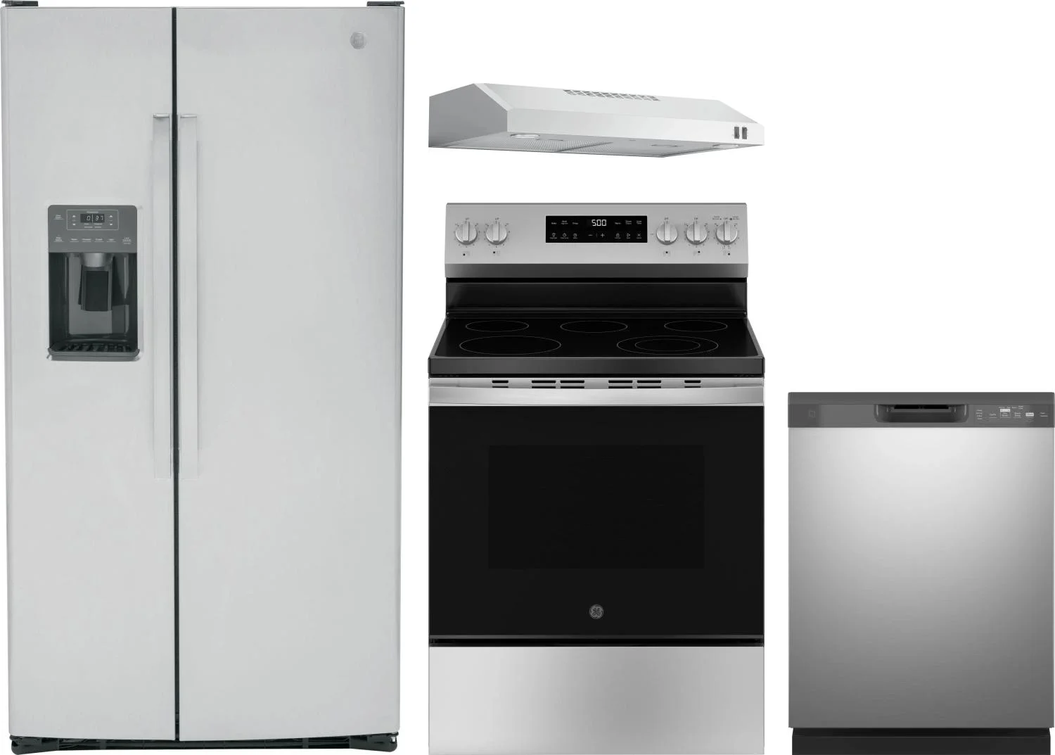 GE 4 Piece Package Includes Refrigerator, Range, Hood And Dishwasher