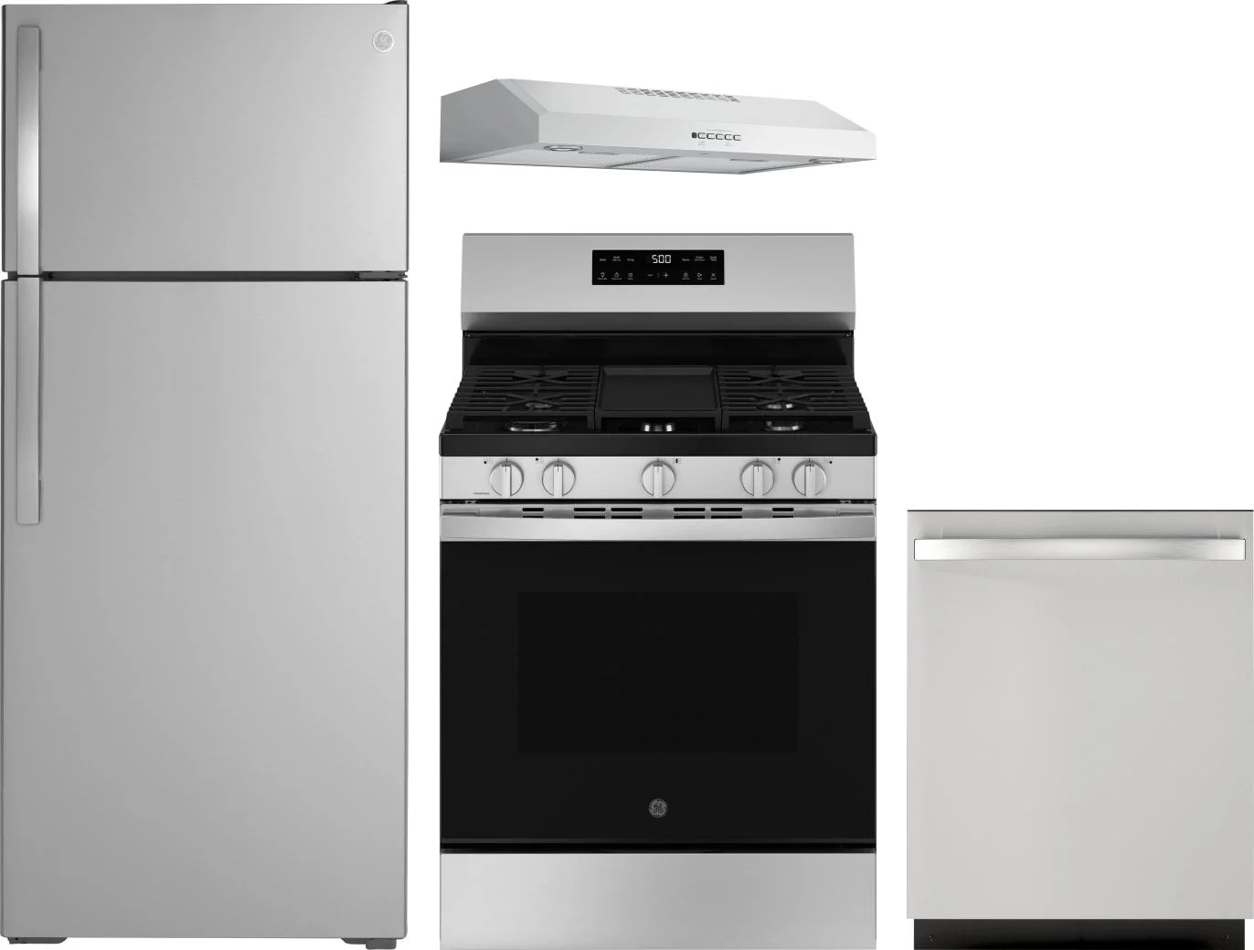 GE 4 Piece Package Includes Refrigerator, Range, Hood And Dishwasher in Stainless Steel