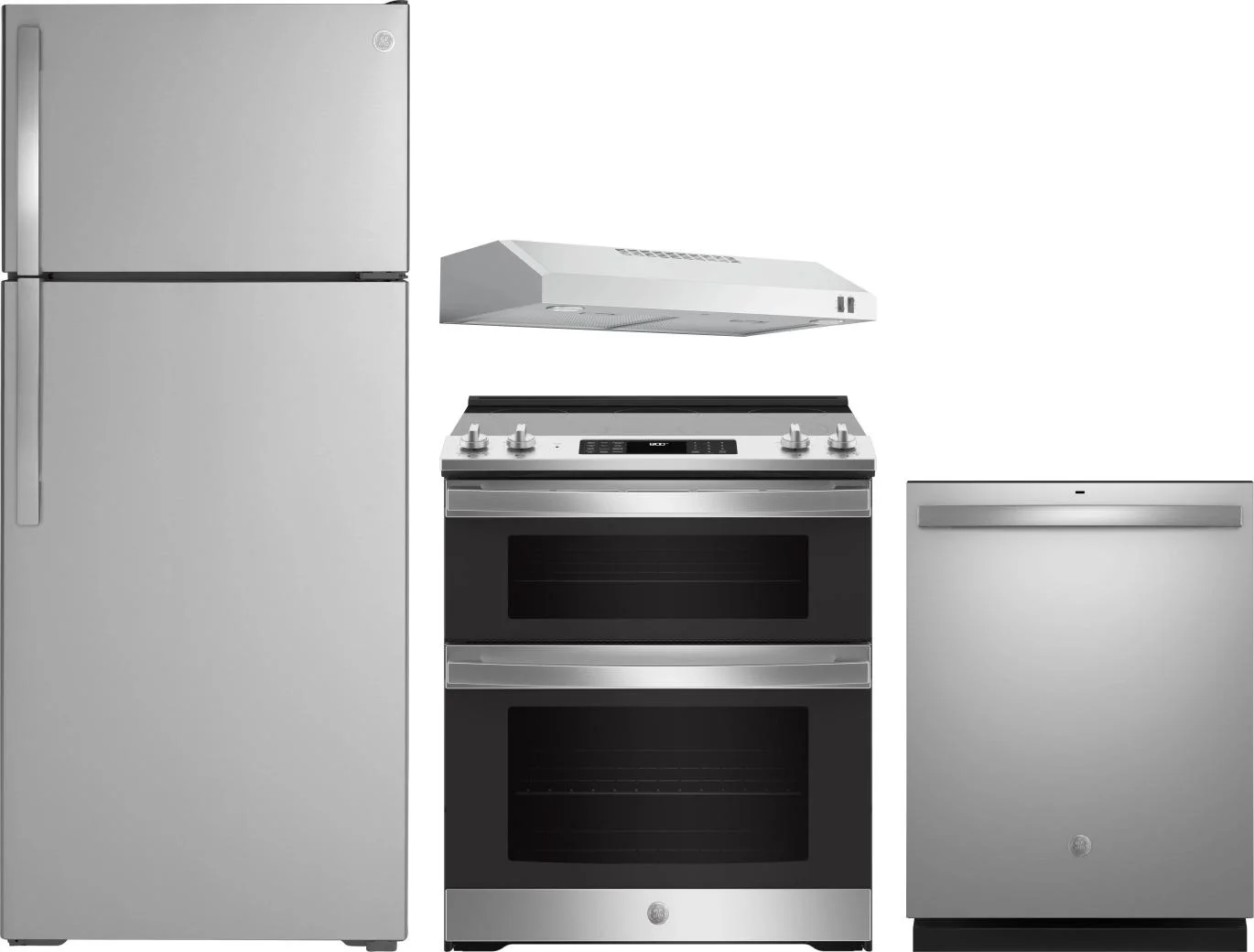 GE 4 Piece Package Includes Refrigerator, Range, Hood And Dishwasher in Stainless Steel
