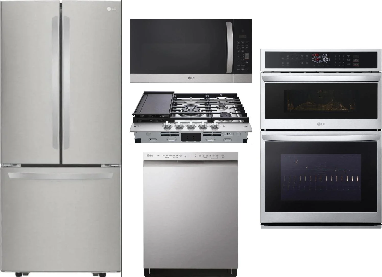 LG 5 Piece Package Includes Refrigerator, Cooktop, Wall Oven, Microwave And Dishwasher in Stainless Steel
