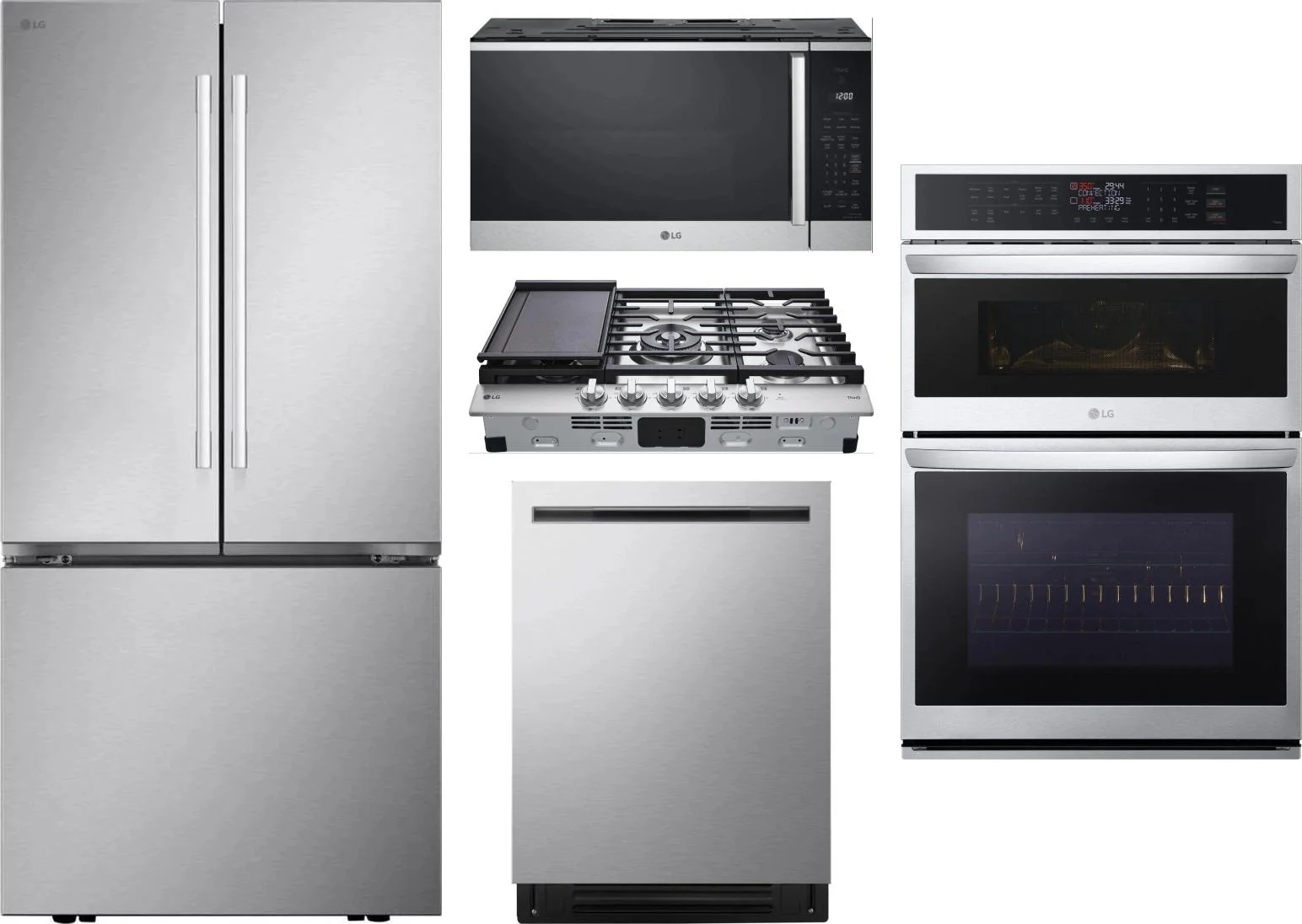 LG 5 Piece Package Includes Refrigerator, Cooktop, Wall Oven, Microwave And Dishwasher in Stainless Steel