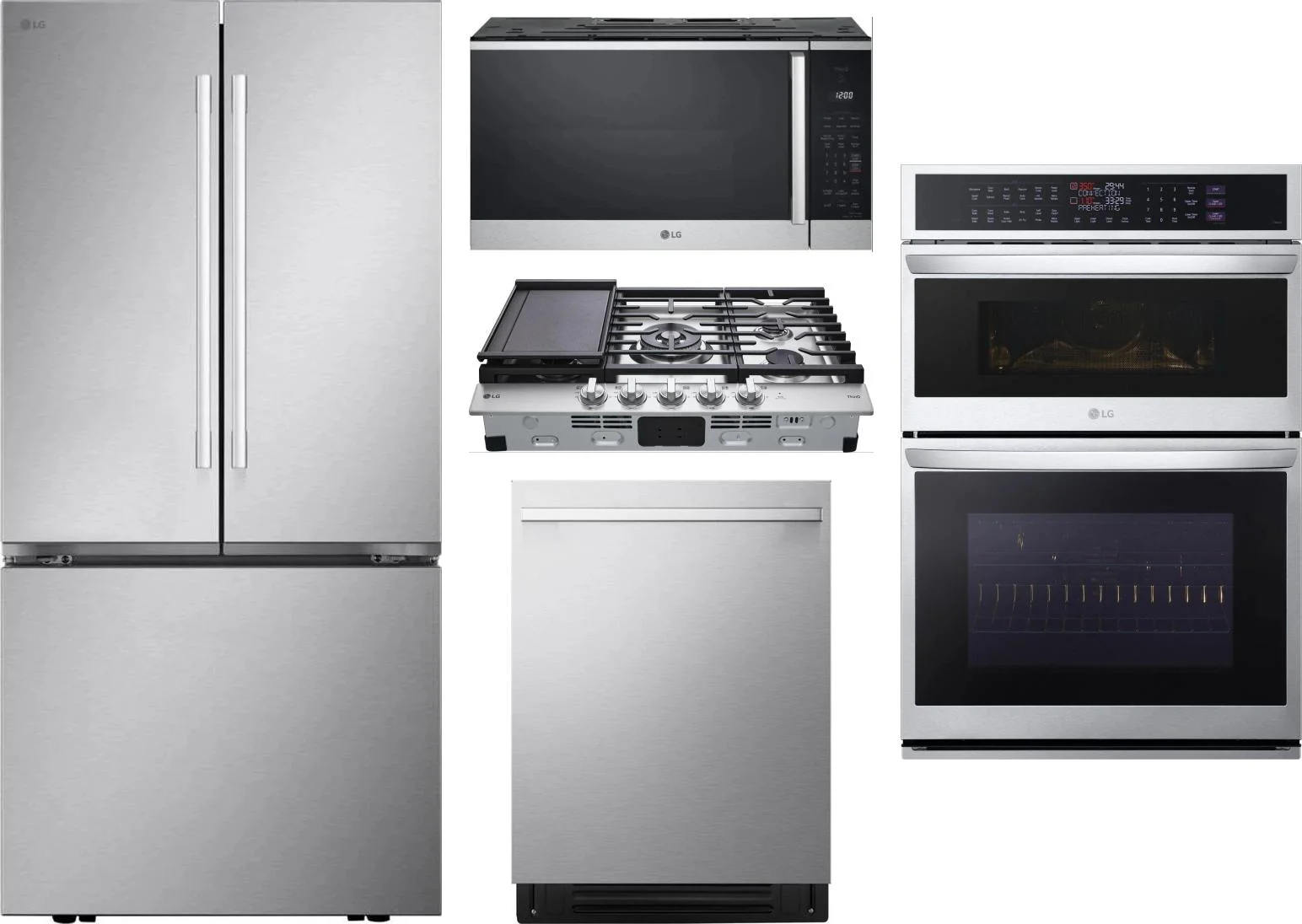 LG 5 Piece Package Includes Refrigerator, Cooktop, Wall Oven, Microwave And Dishwasher in Stainless Steel