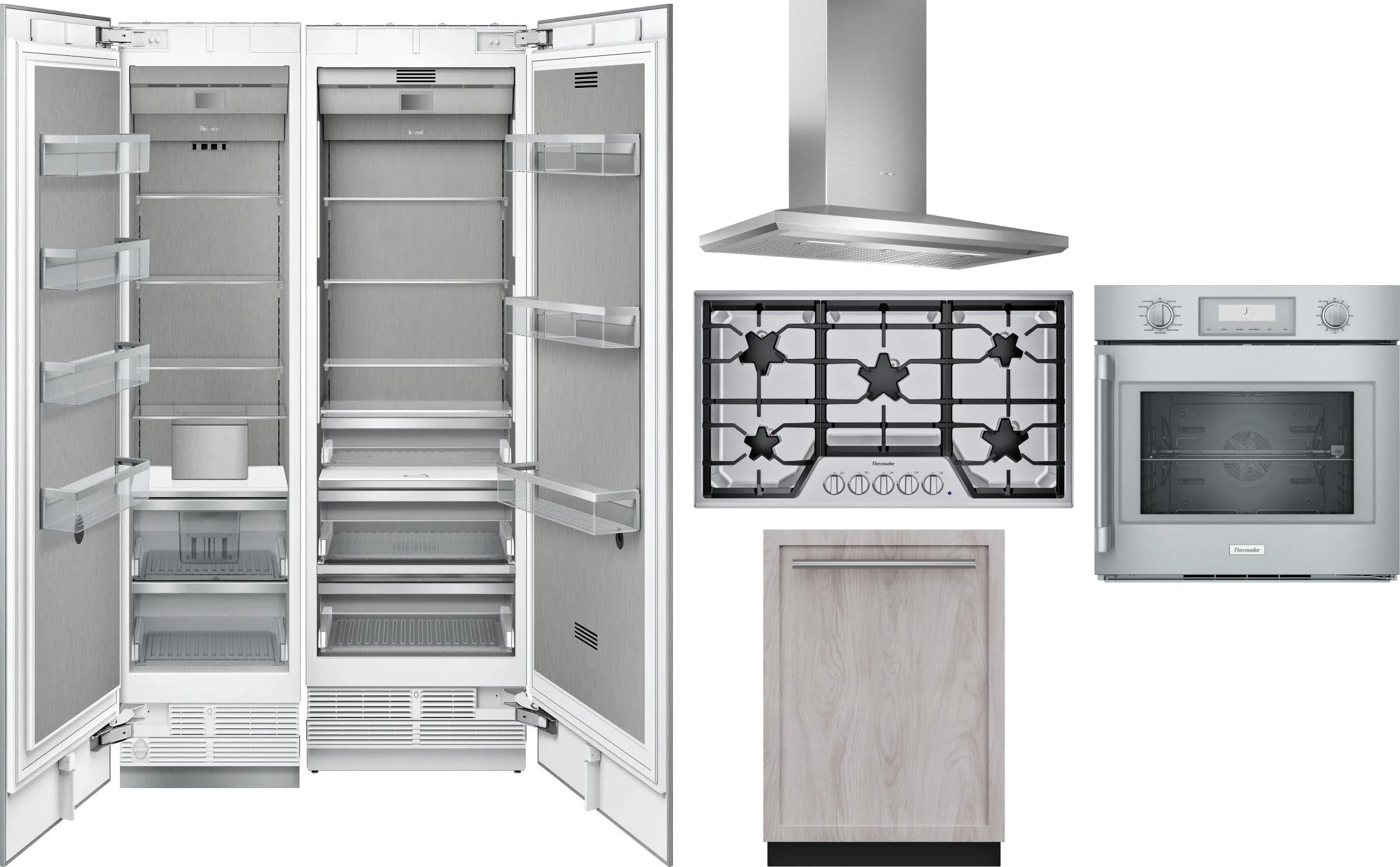 Thermador 6 Piece Package Includes Refrigerator, Freezer, Cooktop, Wall Oven, Hood And Dishwasher