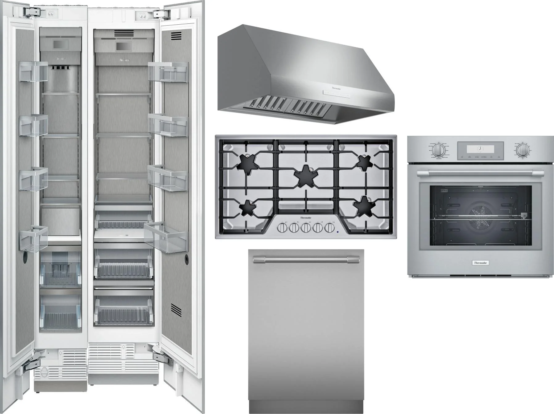 Thermador 6 Piece Package Includes Refrigerator, Freezer, Cooktop, Wall Oven, Hood And Dishwasher