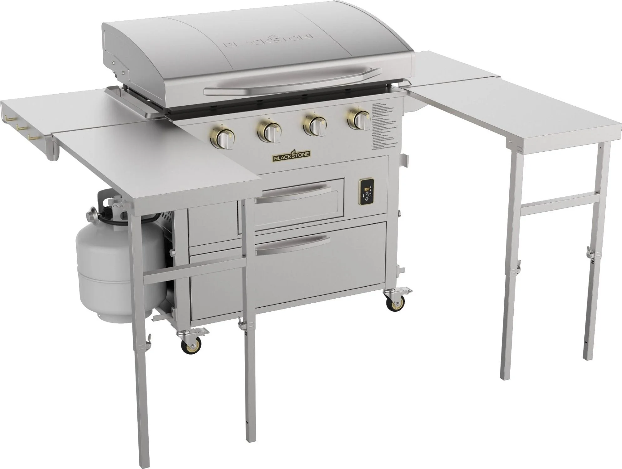 Extendable side tables lift and lock into place to provide 1500 sq inches of preparation space