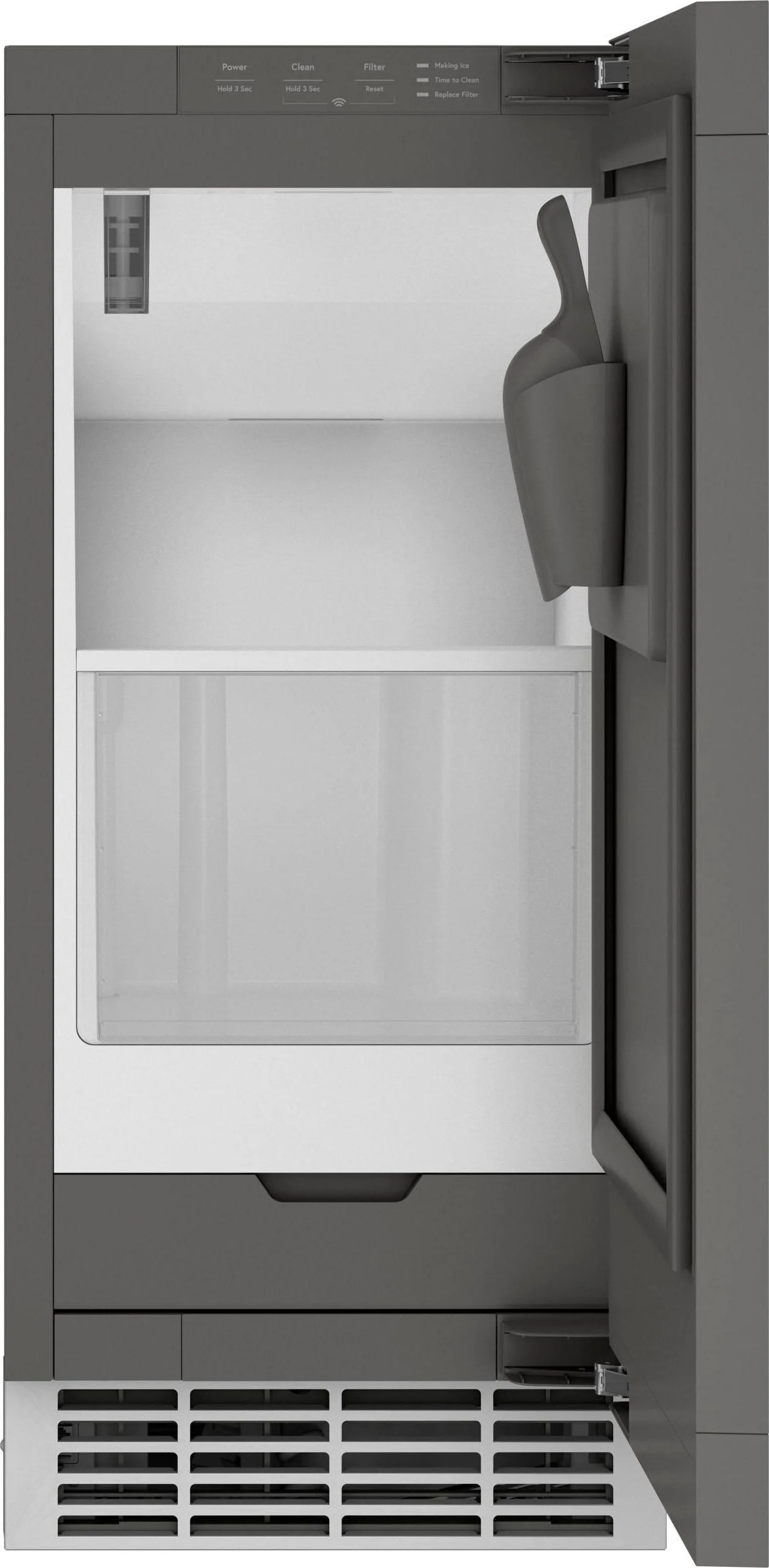 The ice storage bin is clear, so you can easily see how much ice you have on hand