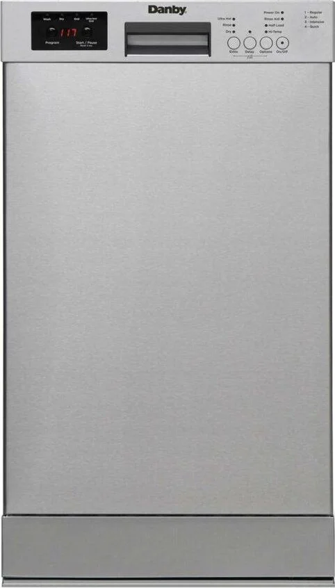 Leave the dirty dishes up to Danbys 18 ENERGY STAR compliant dishwasher, perfect for small space living. This built-in stainless steel dishwasher holds ten place settings and one silverware basket. It has four wash cycles to choose from: regular, auto, intensive, and quick mode. The dishwasher is designed to operate at 51 decibels, which creates less noise and disturbance than the volume of a normal conversation. The delay start feature lets you pre-select the desired start time, so your dishes get washed on your schedule.