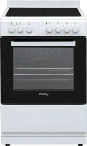 Elevate your kitchen with the Danby 24 Wide Electric Range in White, a perfect blend of compact design and powerful performance for small spaces. Featuring 4 radiant cooktop elements, including two larger, more powerful ones, this range provides the versatility to handle a variety of cooking needs. The two adjustable oven racks with multiple positions offer optimal cooking space, allowing you to prepare multiple dishes at once with ease. With a smooth, easy-to-clean cooktop and an element indicator light, maintaining a tidy kitchen is effortless. The knobs are equipped with a push-and-turn safety feature for added peace of mind, while the mechanical timer ensures precise cooking. Convenient storage is provided by the slide-out drawer, keeping your pots and pans organized and within reach. Experience style, efficiency, and versatility in one appliance, as the Danby range maximizes your kitchens potential for a seamless and enjoyable cooking experience.