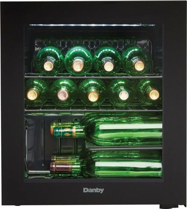Your favorite wines will all have a fine home in this superior compact counter-top wine cooler from Danby. This model takes up minimal space but offers plenty of storage area. Youll be able to chill up to 16 bottles of wine in this 1.8 cubic foot-capacity cooler which is the perfect alternative to storing your favourite brands in the refrigerator. This classy unit is ideal for any bar, office or kitchen setting and the all-black cabinet design will easily fit in with any existing room dcor. Theres additional storage space for accessories with the molded worktop and the convenient reversible door swing can be quickly and easily adjusted for opening from either the left or right-hand side. This high-class appliance features a staggered shelf as well as two vinyl-coated wire storage shelves. Your wines will always be at the perfect temperature as the cooler can be programmed anywhere between 43F to 57F (6C to 14C) . This model also comes with a 12-month warranty on parts and labor.