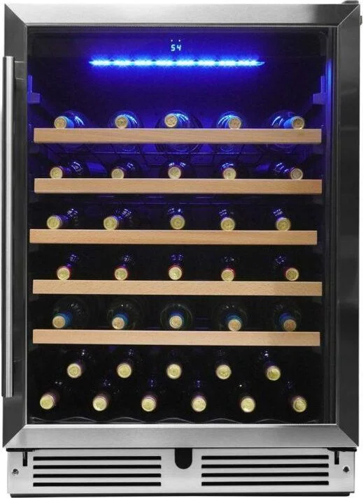 Our 5.7 cu.ft. wine cellar safely stores 63 standard (750ml) bottles of wine on extendable shelves with stunning wood trim. The fridge has strategically placed internal sensors that monitor and react to maintain a stable internal temperature, minimizing stratification. The wine fridge also includes temperature recall, a door ajar alarm, and a temperature alarm. The door is reversible to allow for left hand or right-hand opening. The blue LED interior display light offers two intensity options for optimal visibility. Featuring modern capacitive touch controls, and a 12 month parts and labor warranty, this wine cellar combines functionality and style.
