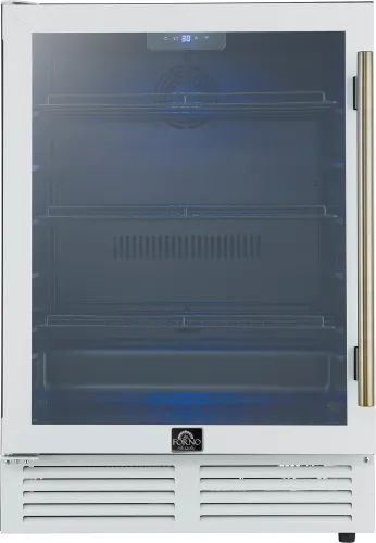 Forno Frescolino 24 Inch Beverage Cooler, White with Antique Brass Handles, with LED Lighting, Triple Glass Door, 188 Can Capacity, Built-In or Freestanding