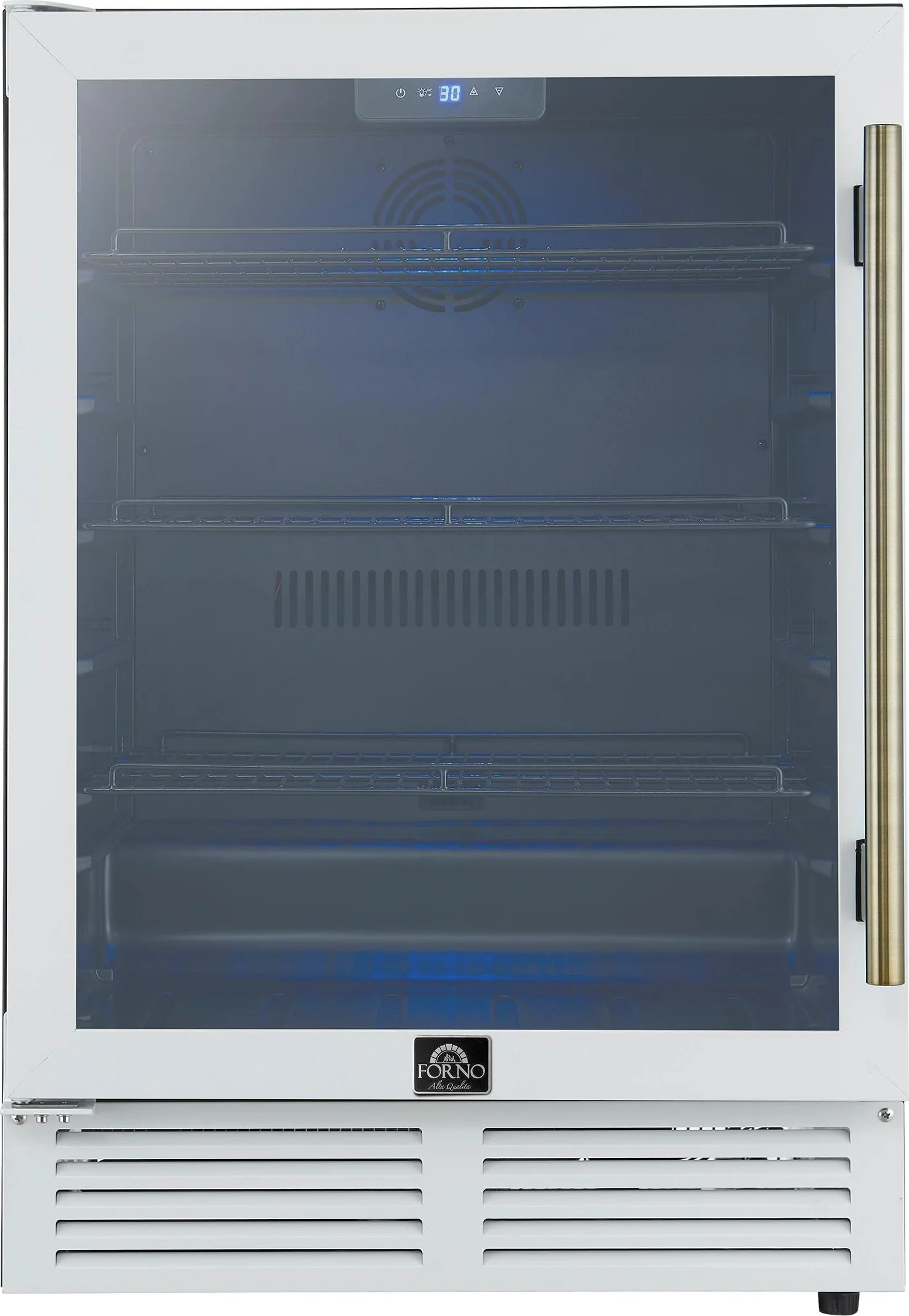 Forno Frescolino 24 Inch Beverage Cooler in White, Antique Brass Handles, Triple Glass Door, 188 Can