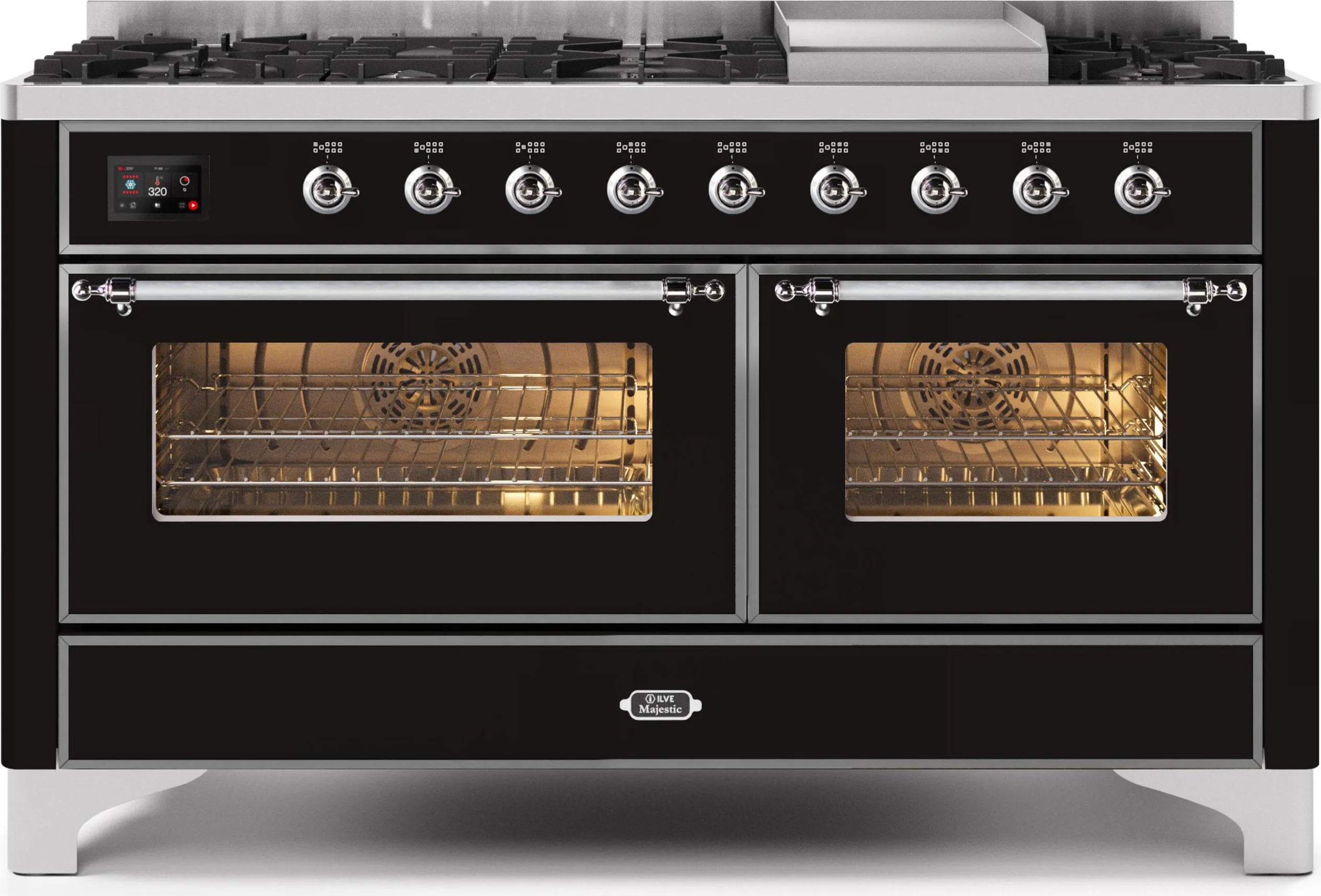 Ilve 60" Majestic II Series Freestanding Dual Fuel Double Oven Range with 8 Sealed Burners, Triple Glass Cool Door, Convection Oven, TFT Oven Control Display, Child Lock and Griddle in Glossy Black in Black