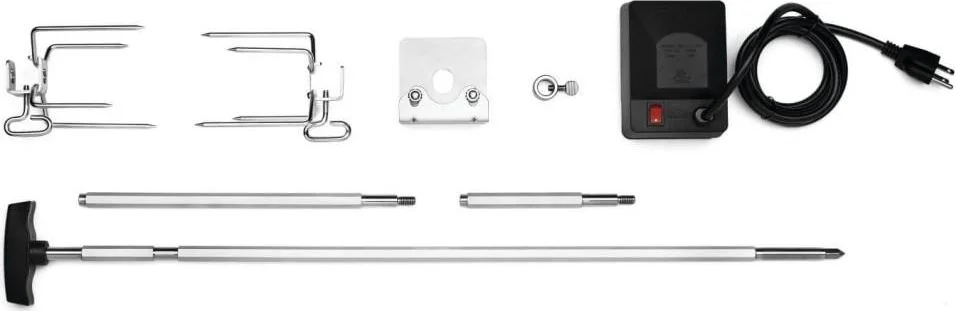 IN THE BOX: Containing 1 heavy duty rotisserie motor, 1 food grade stainless steel rotisserie spit rod, 2 large stainless steel rotisserie forks, 1 stainless steel counter balance assembly, 1 stainless steel stop bushing, 1 T-handle, and rotisserie motor bracket