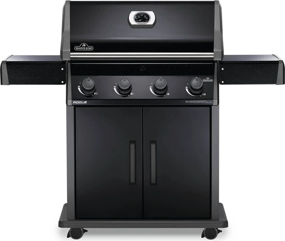 Napoleons Rogue 525 Propane Gas Grill in Black is a large, premium quality grill with an affordable price. Four burners light instantly with a battery-free ignition. This grill features precise temperature control and high heat searing over cast-iron cooking grids. The stylish black exterior is highly durable and easy to clean.