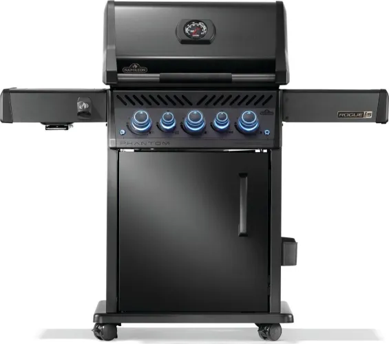 The Phantom Rogue PRO-S 425 Grill in Natural Gas, boasts a luxurious, matte black finish that exudes elegance. Crafted with premium features, this grill seamlessly combines sophistication and luxury. Its rear infrared rotisserie burner guarantees succulent roast meals, while the infrared sear station, side burner delivers restaurant-quality sides and sauces or sears meat to perfection. The iconic WAVE shaped cooking grids ensure even heating, while dual-level stainless steel sear plates vaporize drippings, keeping your barbecue pristine. With ergonomic control knobs for easy and safe operation and a battery-free starter for instant ignition, this grill is designed for effortless performance. A convenient space-saving folding side shelf and easy-locking casters enhance versatility. Elevate your outdoor grilling experience with this premium BBQ, offering superior quality and style. Rotisserie sold separately.
