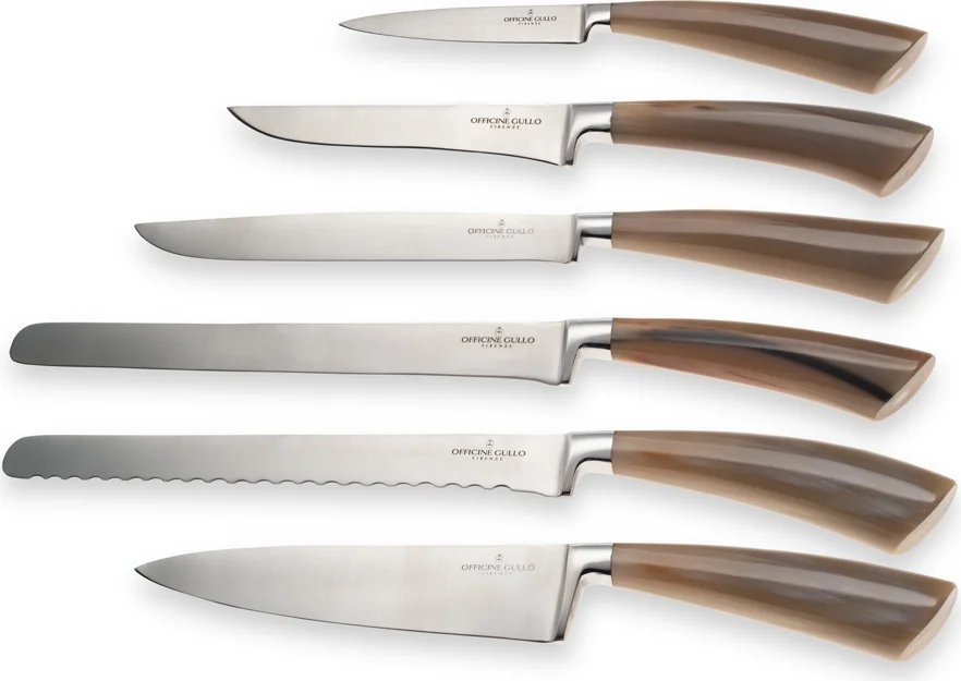 Officine Gullo enhances the ambiance of every kitchen with an elegant selection of table accessories inspired by the finest Florentine craftsmanship. Knives and knife blocks, cutting boards, glasses, cutlery, plates and decorative service plates, copper pans, bottle racks, leather placemats, and bread baskets. The Officine Gullo style makes the home a place to live and to be enjoyed, designed for good times and the pleasures of the table.