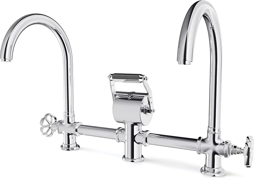 Double monocommand mixer with a visually arresting design inspired by the nautical world, designed for large sinks, such as double washbasins. The central control stick, which resembles a motorboat’s joystick, adjusts the water temperature.