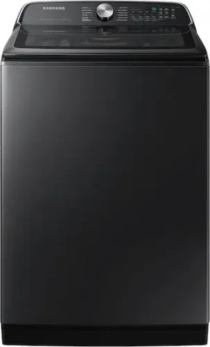 Samsung's 5.5 cu. ft. extra-large capacity smart top load washer in brushed black features the ActiveWave(TM) agitator, which reduces noise, vibration, and tangling while delivering powerful laundry cleaning performance.