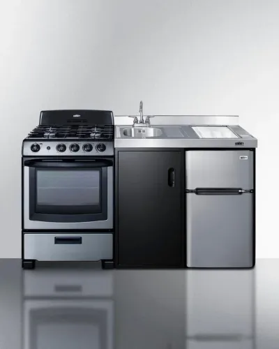 PRO247SS stainless steel gas range is packed with the kitchenette. This 115V gas range includes four sealed burners (1-12000 BTU, 2-9500BTU, 1-5000 BTU) with cast iron grates, 2.9 cu.ft. oven with adjustable racks, and is LP convertible (kit included)
