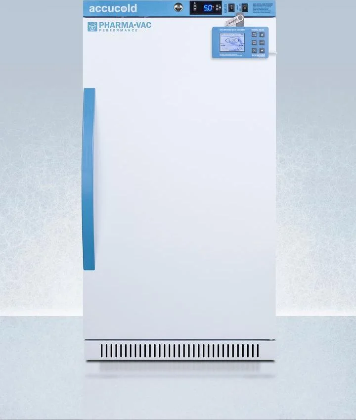 Accucold's Pharma-Vac Performance Series are upright all-refrigerators designed and purpose-built for pharmacy, medication, and vaccine applications to support meeting CDC/VFC/VFA guidelines. The ARS32PVBIADADL2B is a 2.83 cu.ft. all-refrigerator with a temperature range of +2(degree)C to +8(degree)C. Sized at 32" high to fit under lower counters complying with ADA guidelines for accessibility. It is designed for freestanding or recessed installation. The microprocessor temperature controller is externally located to minimize door openings, helping to protect stored contents from ambient temperature. The buffered temperature probe is encased in a glycol-filled bottle to better simulate temperature of the stored product, with an additional sensor that reads air temperature to ensure superior temperature control. The current and min/max temperature display is viewable in Celsius or Fahrenheit to the nearest tenth of a degree. The audible and visual temperature alarm sounds if the unit's interior goes out of range. Additional alarms include a power failure alert, door open alarm, and sensor failure alarm. This model is equipped with remote alarm contacts in the rear and a 1/2" probe port on the right side to accept additional monitoring devices. A hospital grade cord with 'green dot' plug is also included for added safety in high traffic areas. We also include our DL2B digital data logger to be mounted to the door, a feature recommended by the CDC, VFC and VFA for vaccine storage. This password-protected DDL is NIST calibrated in our ISO/IEC 17025:2017 accredited laboratory and offers a large LCD display of the current and high/low temperature, recording up to 32,000 data groups to its internal memory or even more on the included 4GB USB flash drive. Data can be viewed through a PC or Mac in Microsoft Excel or any .CSV compatible program. Users can set their own recording intervals starting at increments of 10 seconds to best meet a facility's specific logging needs. We include a 2-year certificate of calibration beginning the date of manufacture. The logger can be re-calibrated in our laboratories after the certificate expires. (For additional information on the DDL, see the DL2BKit listing on our website.) Inside, the ARS32PVBIADADL2B utilizes adjustable cycle defrost operation to avoid temperature spikes. Optimized forced air cooling with an internal fan to ensure excellent temperature stability and uniformity with rapid recovery after door openings. The adjustable plastic-coated wire shelves can be positioned at 1/2" increments to accommodate virtually any sized item. This unit includes LED internal lighting with an on/off rocker switch. The interior is constructed from white powder coated metal to ensure added durability and better temperature retention. The ARS32PVBIADADL2B comes in a white cabinet finish with a blue accented control panel. The factory-installed antimicrobial handle is powder-coated with naturally occurring silver ions, which help to reduce the spread of germs, allowing for a safer, cleaner user experience. The door ships with a right hand swing and self-closing function, while a factory-installed lock provides security as needed, with two keys for staff use. Powerful magnetic gaskets ensure a positive seal. Designed with hydrocarbon refrigerant, the ARS32PVBIADADL2B provides an energy efficient solution to vaccine storage. This unit is Pyxis, Omnicell, and AcuDose RX compatible. Additional sizes, as well as solid door options, are also available. Explore the full Pharma-Vac series at accucold.com/pharmavac. NOTE: Accucold refrigerators are purpose-built to the support meeting the current CDC (Centers for Disease Control) guidelines for the storage of vaccines. Units that end in suffix "456" have been certified to the new NSF 456 standard. As referenced in the current Vaccine Storage and Handling Toolkit, these units incorporate microprocessor controls and forced air circulation for stable operation between 2 and 8 C. For additional temperature assurance, the CDC recommends a calibrated digital data logger (DDL), which can be added with the factory-installed option DL2B or addition of the DL2BKit accessory.