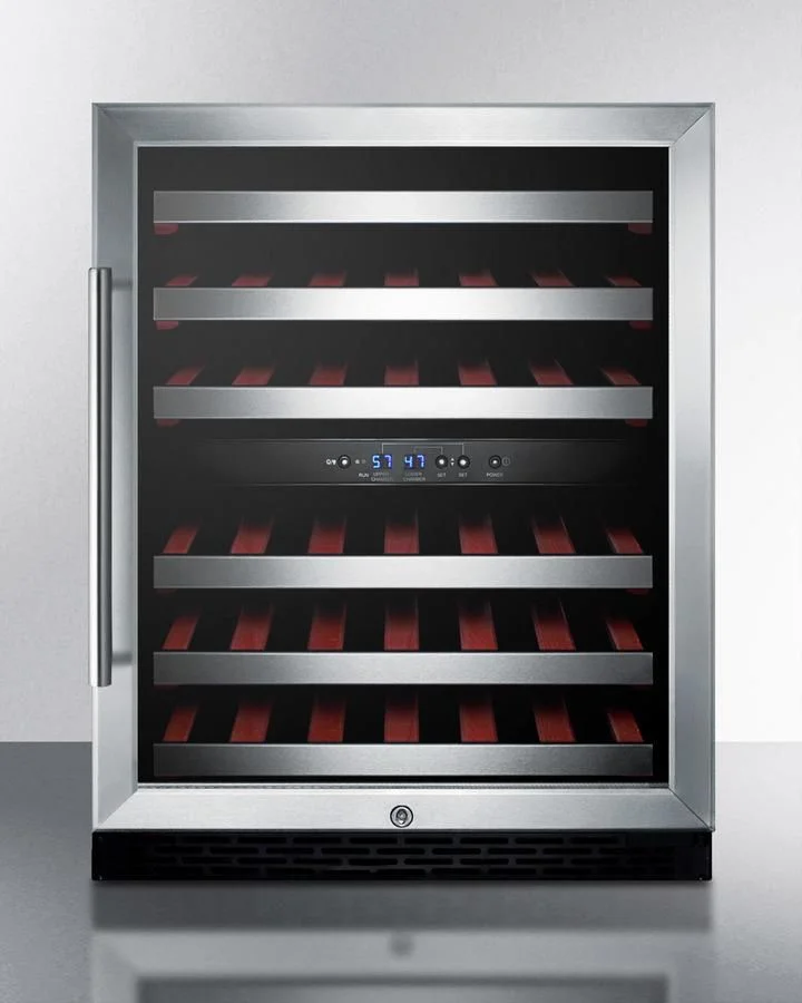 Lower zone for reds has a temperature range of 10 C/50 F to 18 C/64 F; Upper zone stores whites and sparkling wine between 5 C/41 F to 10 C/50 F