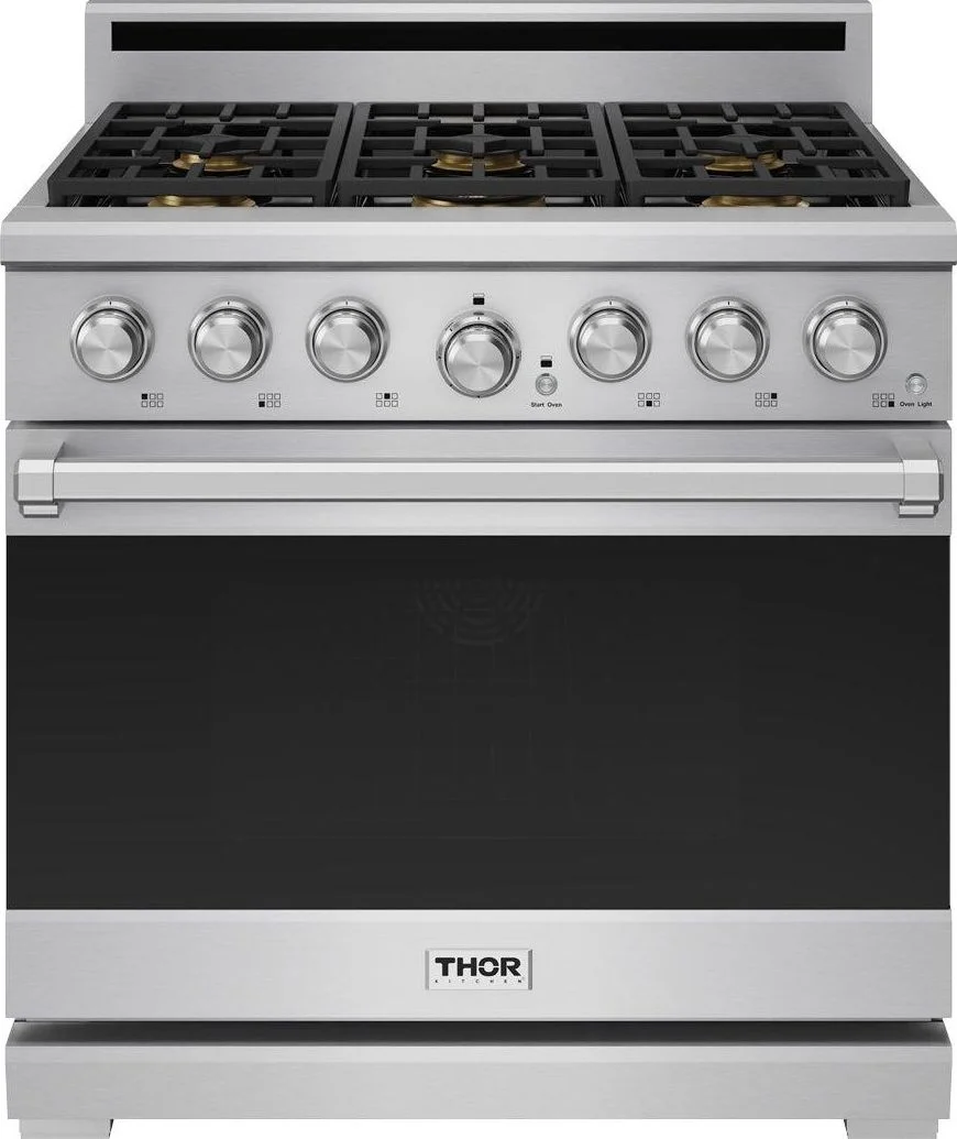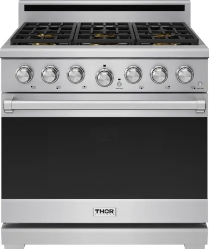 The THOR Kitchen XRG36E is a 36 inch professional gas range designed for serious home cooks, combining powerful cooktop performance with versatile oven capabilities. It features six sealed Italian brass burners including a high output 22,000 BTU dual burner with precision simmer control, all on continuous cast iron grates for durability and easy cookware movement. The spacious 6.0 cu ft oven offers multiple cooking modes such as Bake, Convection Bake, Roast, Convection Roast, Broil, Keep Warm, Pizza, and Self Clean, and includes LuxGlide(TM) telescopic racks and a soft close oven door for convenient handling and premium usability. Additional highlights include blue LED illuminated knobs, infrared broiler, automatic re ignition, and built in casters with leveling legs for secure installation and mobility.