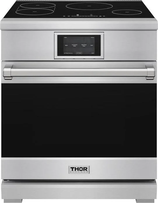 The THOR Kitchen XRI30E is a 30-inch professional freestanding electric induction range designed for serious home cooks, featuring a 4.8 cu ft oven with versatile cooking modes including bake, roast, broil, keep warm, proof, pizza, self-clean, and air fry, all controlled via a tilt panel touch screen for easy visibility and use. The smooth glass cooktop offers four powerful induction zones, including bridge cooking for griddles or oversized cookware, and delivers precise, efficient heating, while the oven s true convection fan ensures even results. Thoughtful details such as LuxGlide(TM) telescopic racks, a soft-close oven door, built-in casters and leveling legs, and included accessories like a broiler pan, air fry basket, and meat probe enhance convenience and performance.