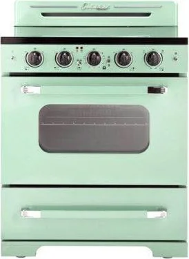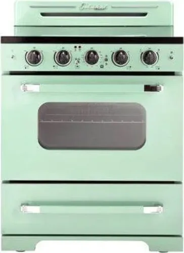 The 30" Classic Retro Electric Range transports you back to the 50s with its iconic retro design and chrome finished accents. It has a 5-element sleek glass electric cooktop capable of an intense sear or delicate sauce simmering. This range also allows for convection cooking circulating heat for incredibly even distribution.