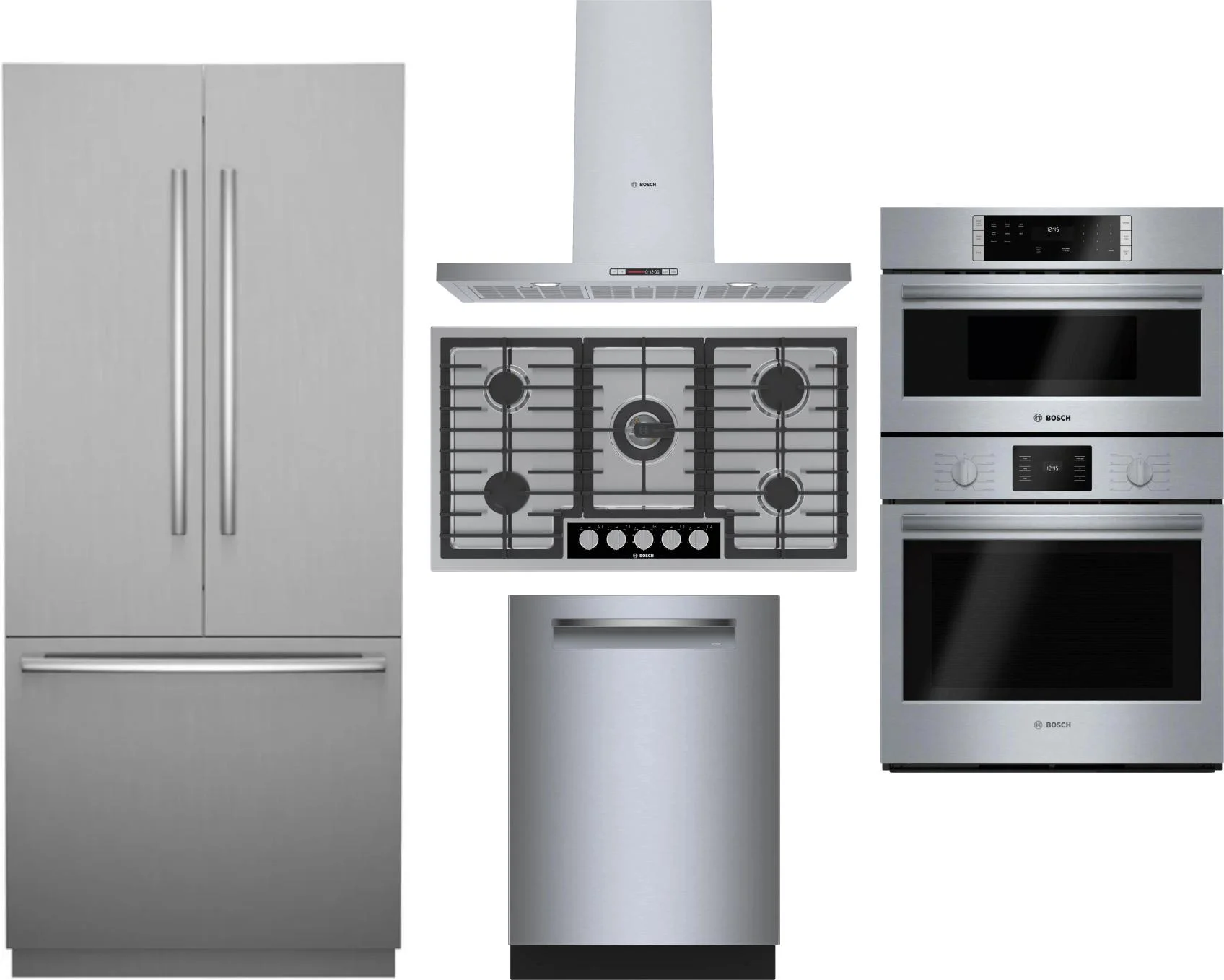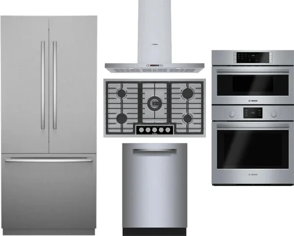 Bosch 5 Piece Package Includes Refrigerator, Cooktop, Wall Oven, Hood And Dishwasher