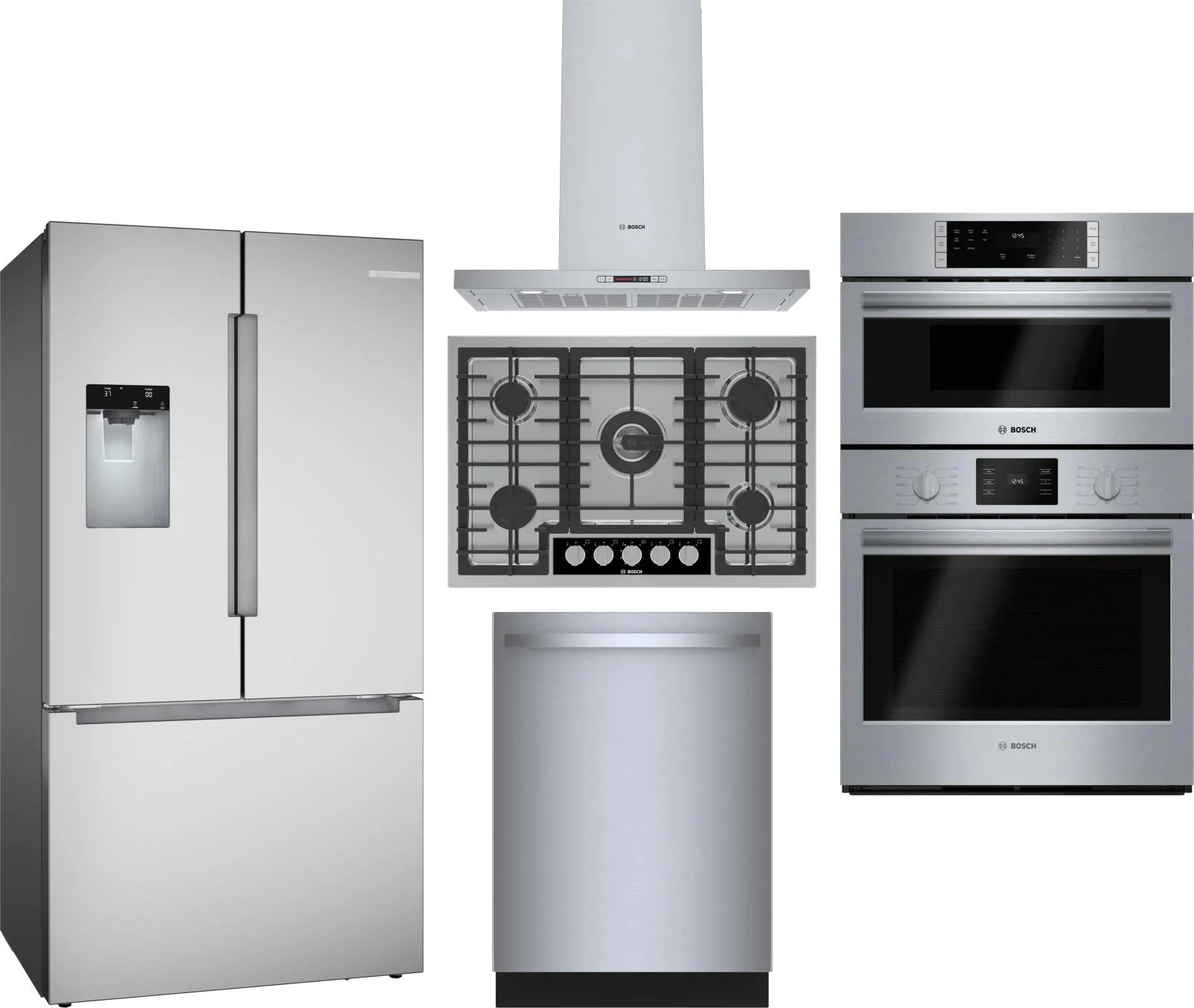Bosch 5 Piece Package Includes Refrigerator, Cooktop, Wall Oven, Hood And Dishwasher