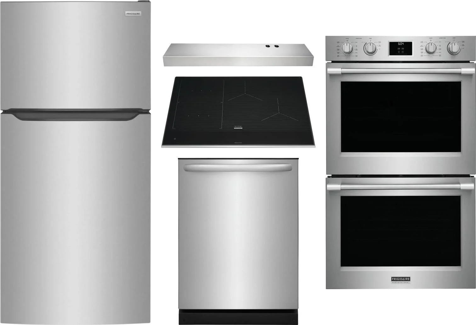 Frigidaire 5 Piece Package Includes Refrigerator, Cooktop, Wall Oven, Hood And Dishwasher in Stainless Steel