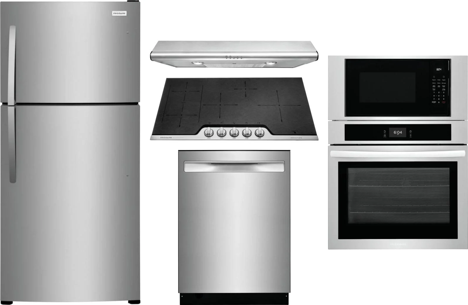 Frigidaire 5 Piece Package Includes Refrigerator, Cooktop, Wall Oven, Hood And Dishwasher in Stainless Steel