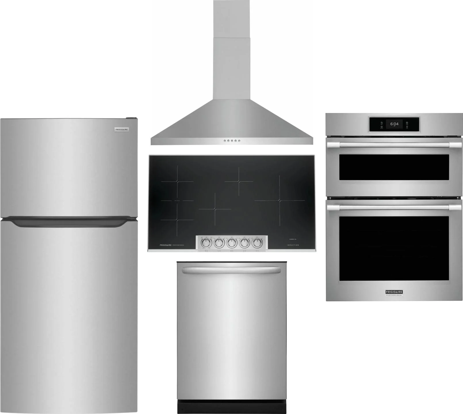 Frigidaire 5 Piece Package Includes Refrigerator, Cooktop, Wall Oven, Hood And Dishwasher in Stainless Steel