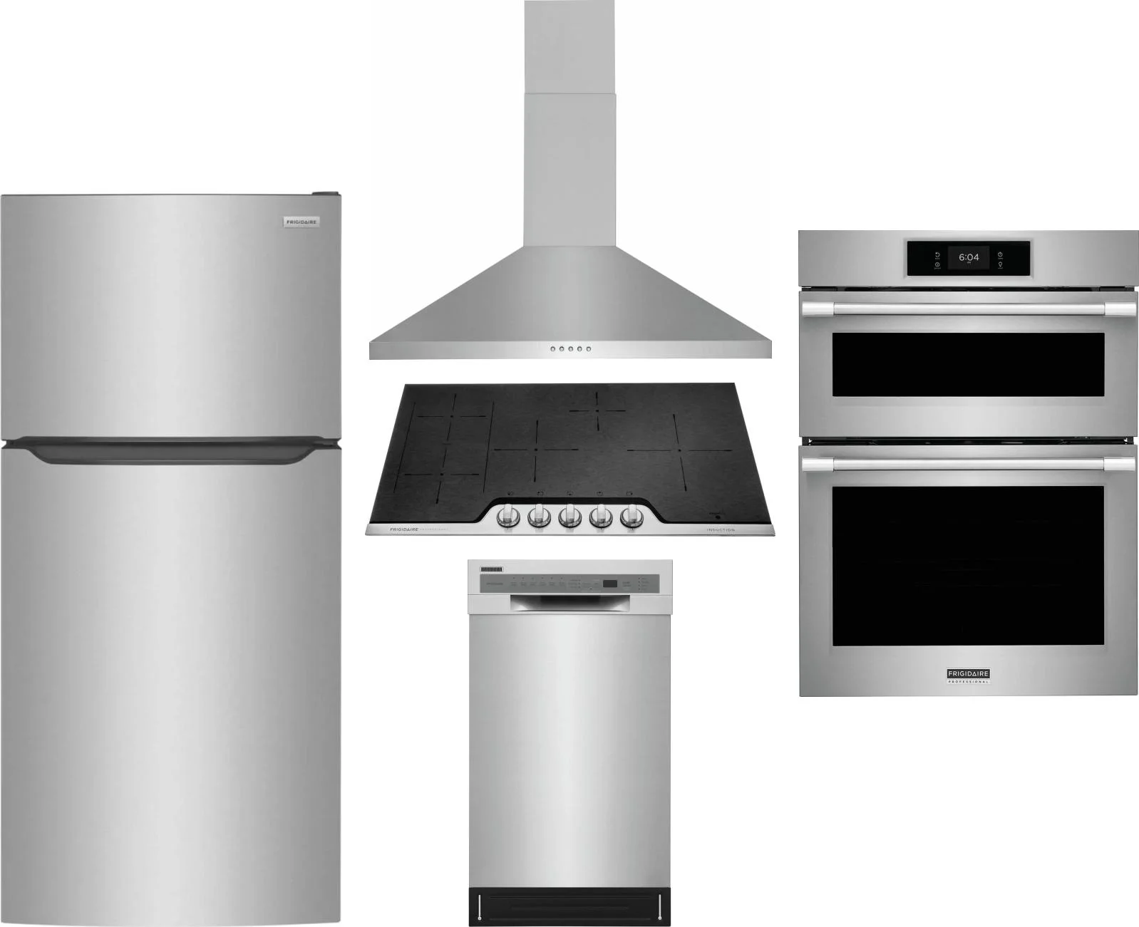 Frigidaire 5 Piece Package Includes Refrigerator, Cooktop, Wall Oven, Hood And Dishwasher in Stainless Steel