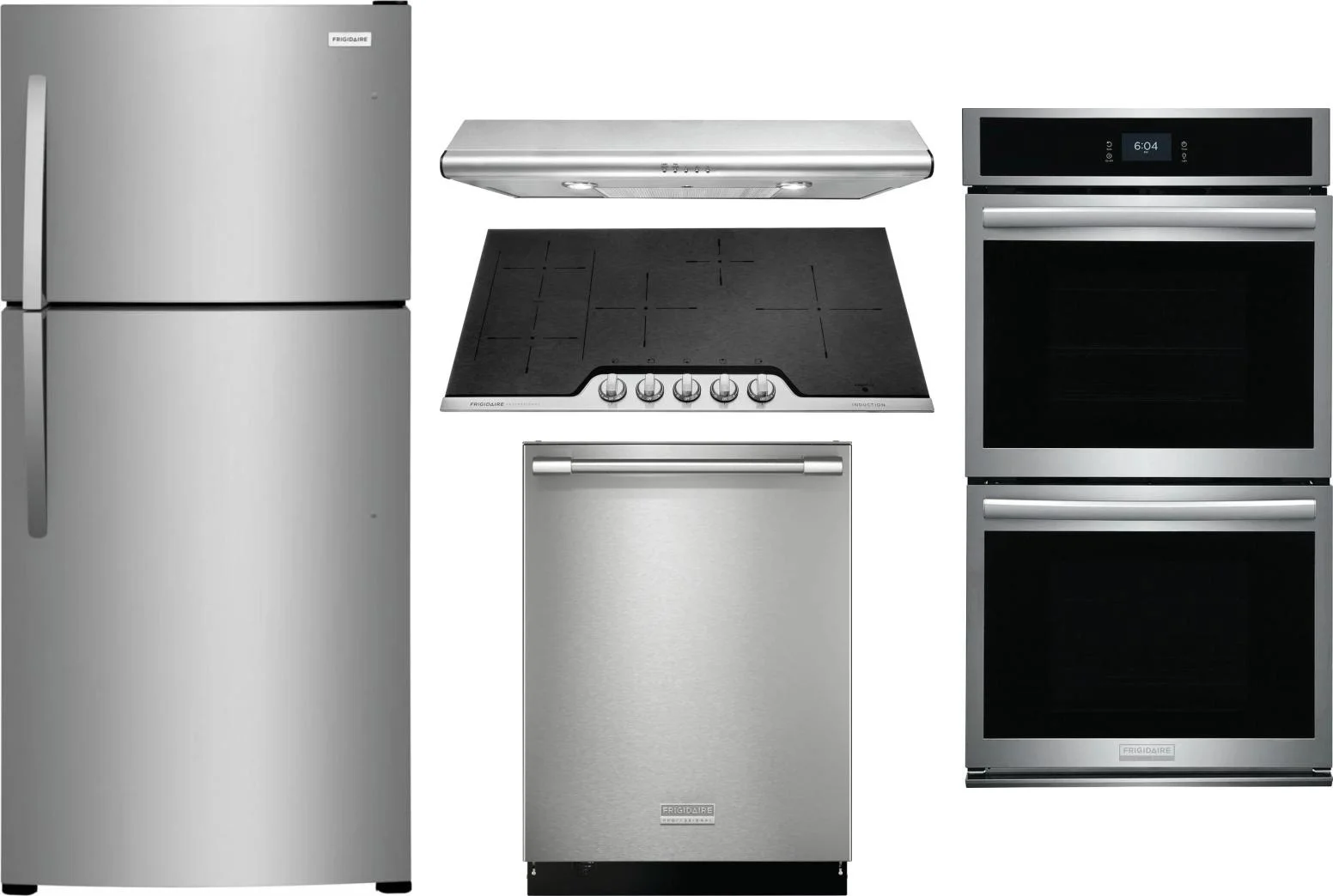 Frigidaire 5 Piece Package Includes Refrigerator, Cooktop, Wall Oven, Hood And Dishwasher in Stainless Steel