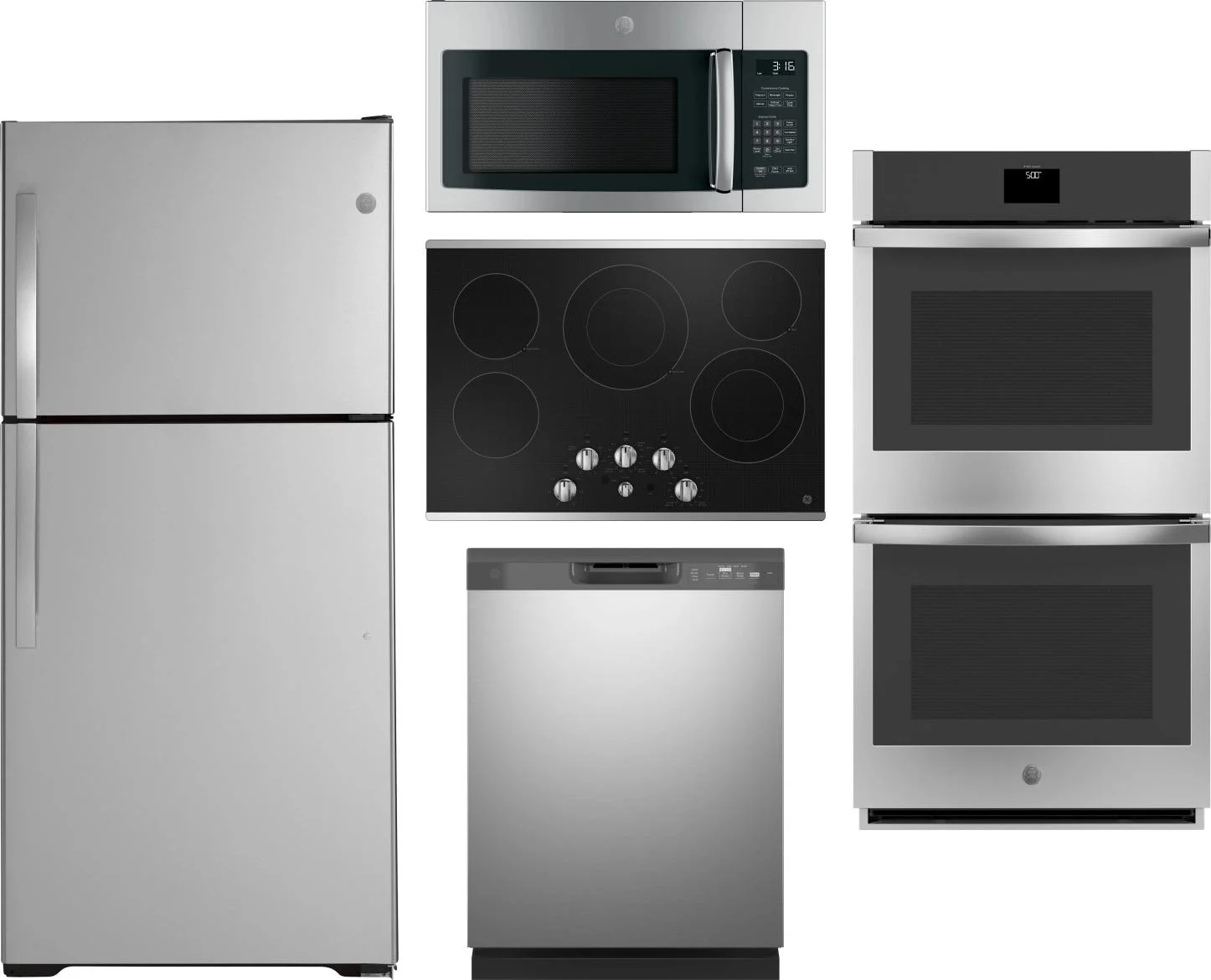 GE 5 Piece Package Includes Refrigerator, Cooktop, Wall Oven, Microwave And Dishwasher in Stainless Steel