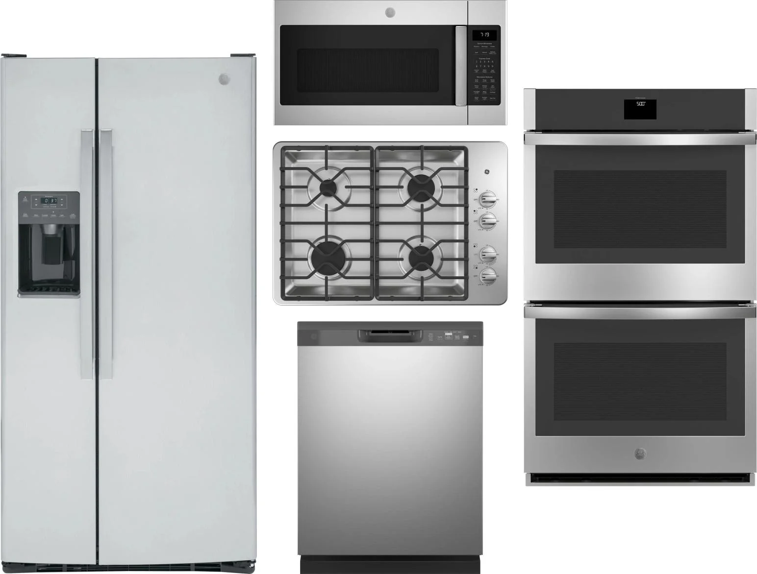 GE 5 Piece Package Includes Refrigerator, Cooktop, Wall Oven, Microwave And Dishwasher