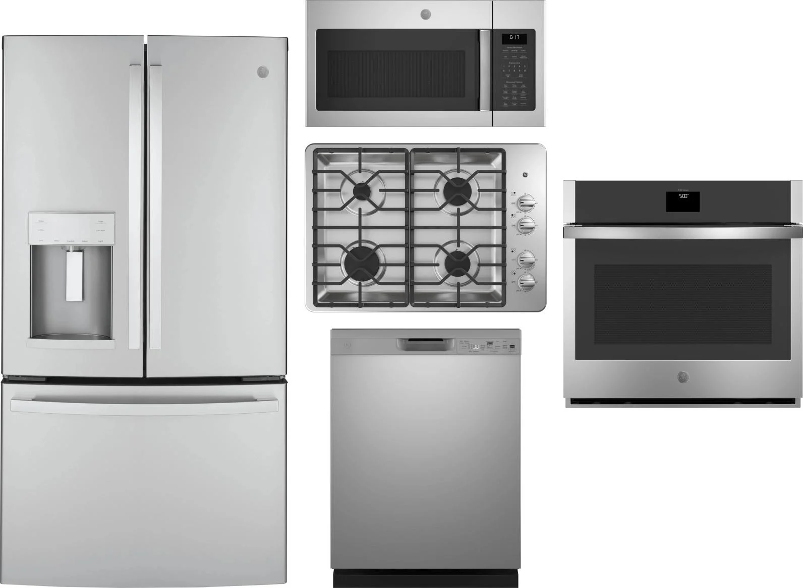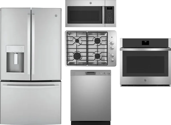 GE 5 Piece Package Includes Refrigerator, Cooktop, Wall Oven, Microwave And Dishwasher