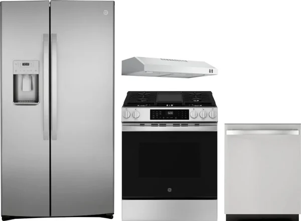 GE 4 Piece Package Includes Refrigerator, Range, Hood And Dishwasher
