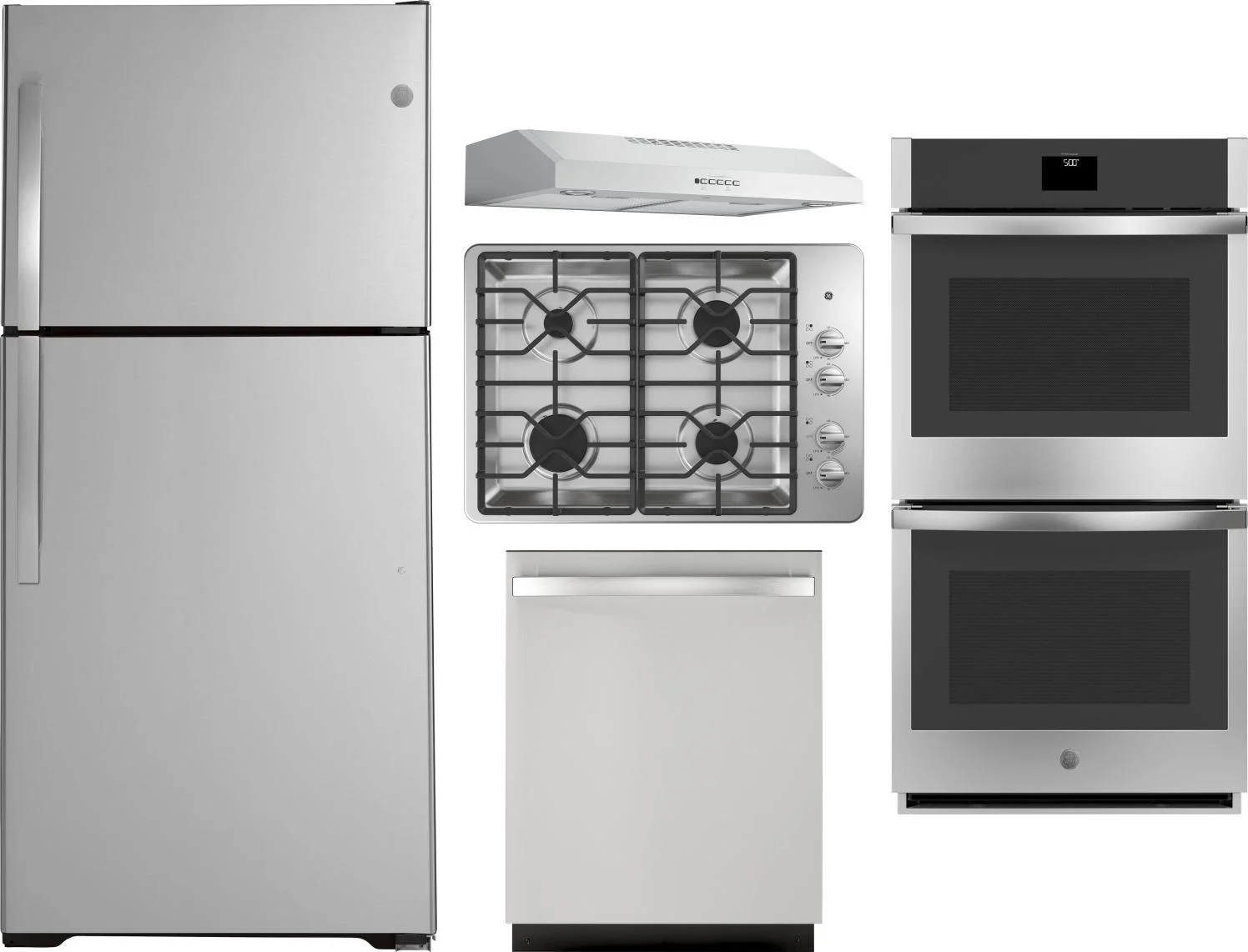 GE 5 Piece Package Includes Refrigerator, Cooktop, Wall Oven, Hood And Dishwasher in Stainless Steel