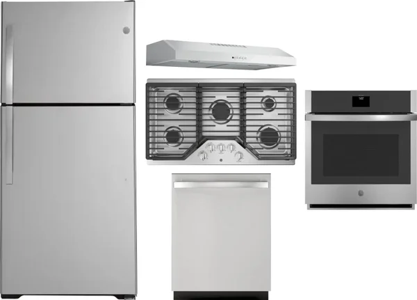 GE 5 Piece Package Includes Refrigerator, Cooktop, Wall Oven, Hood And Dishwasher