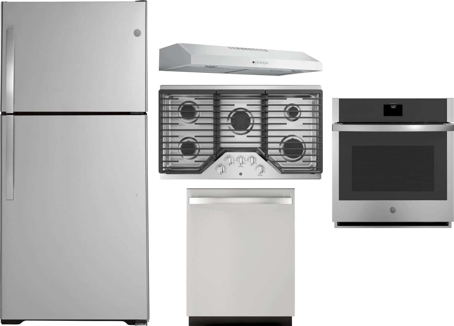 GE 5 Piece Package Includes Refrigerator, Cooktop, Wall Oven, Hood And Dishwasher in Stainless Steel