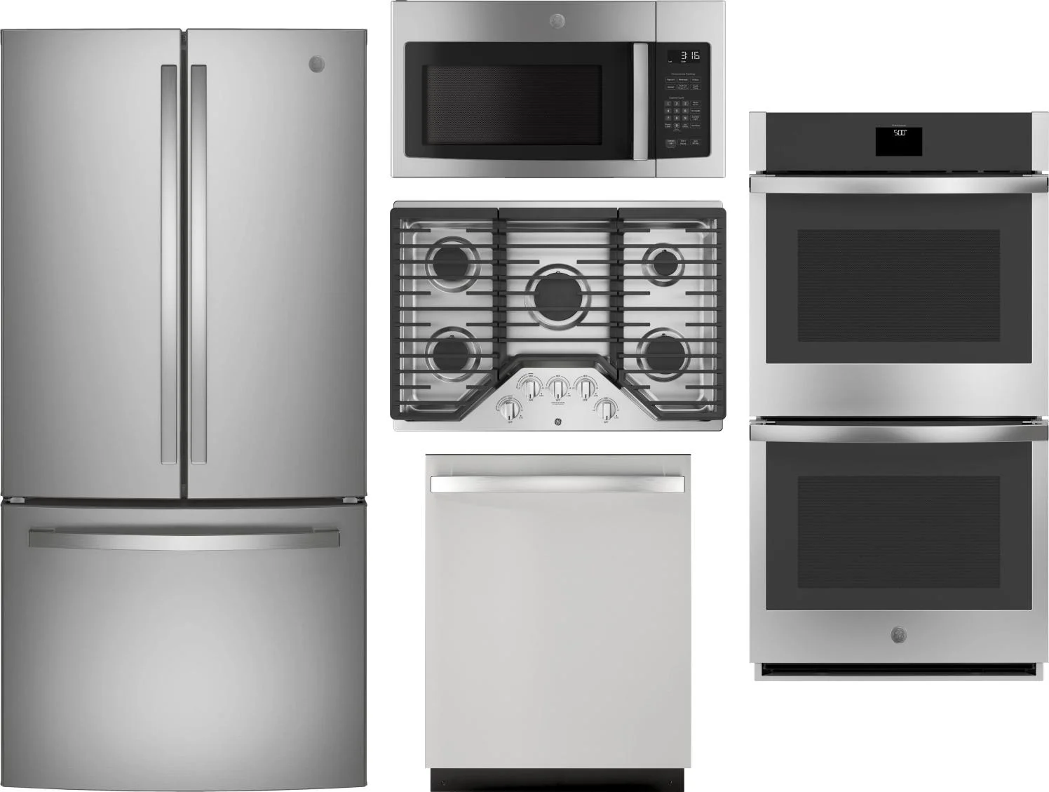 GE 5 Piece Package Includes Refrigerator, Cooktop, Wall Oven, Microwave And Dishwasher