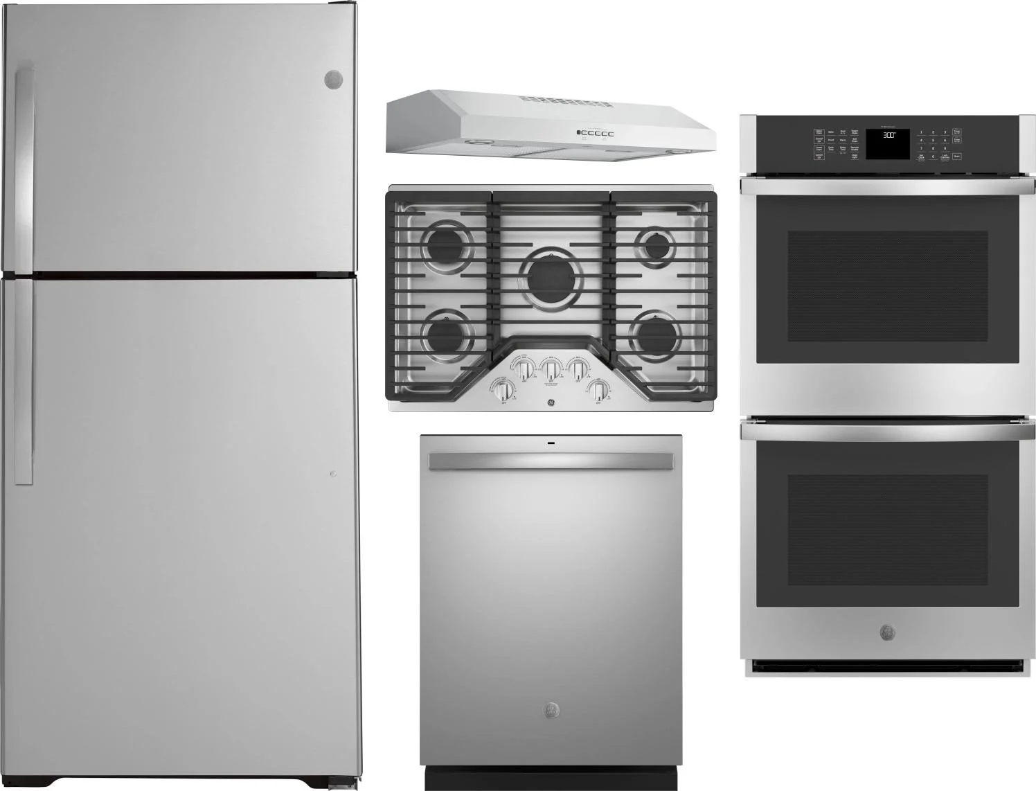 GE 5 Piece Package Includes Refrigerator, Cooktop, Wall Oven, Hood And Dishwasher in Stainless Steel