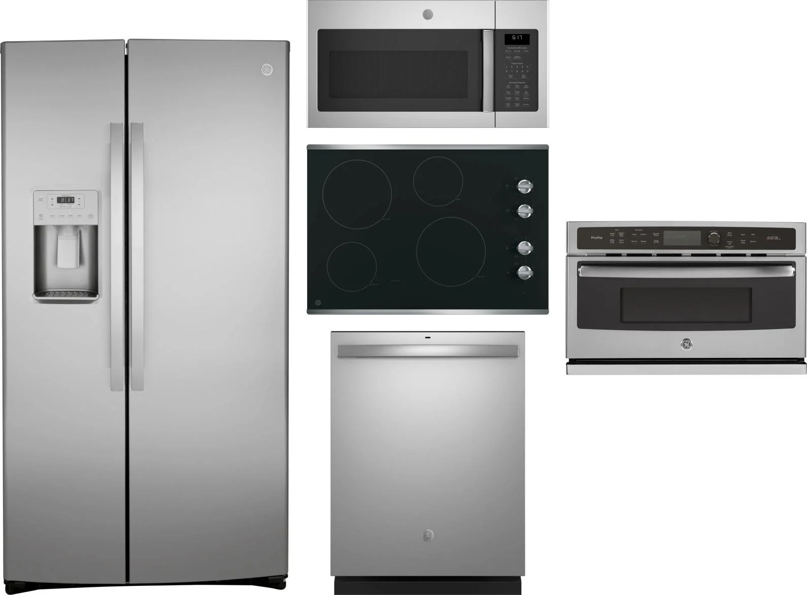 GE 5 Piece Package Includes Refrigerator, Cooktop, Wall Oven, Microwave And Dishwasher