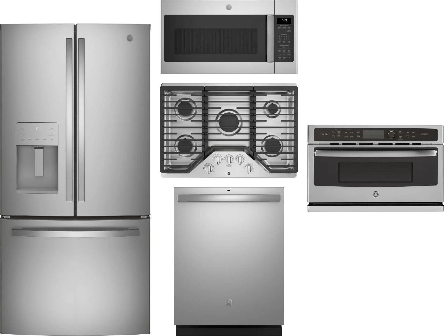 GE 5 Piece Package Includes Refrigerator, Cooktop, Wall Oven, Microwave And Dishwasher in Stainless Steel