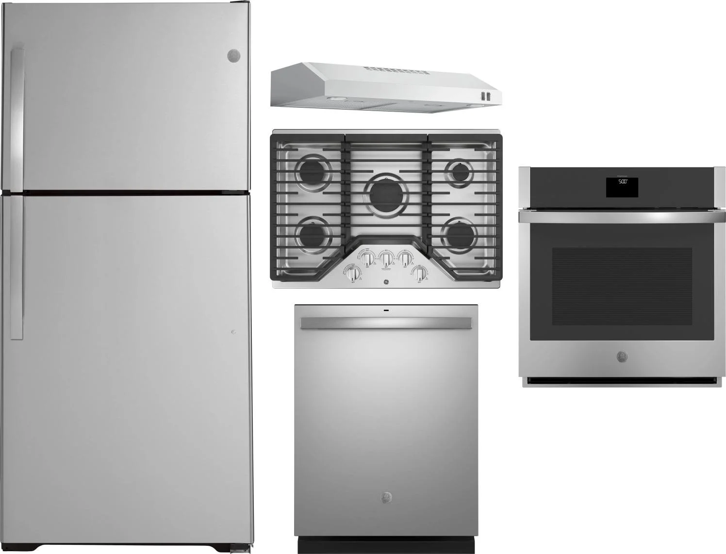 GE 5 Piece Package Includes Refrigerator, Cooktop, Wall Oven, Hood And Dishwasher in Stainless Steel