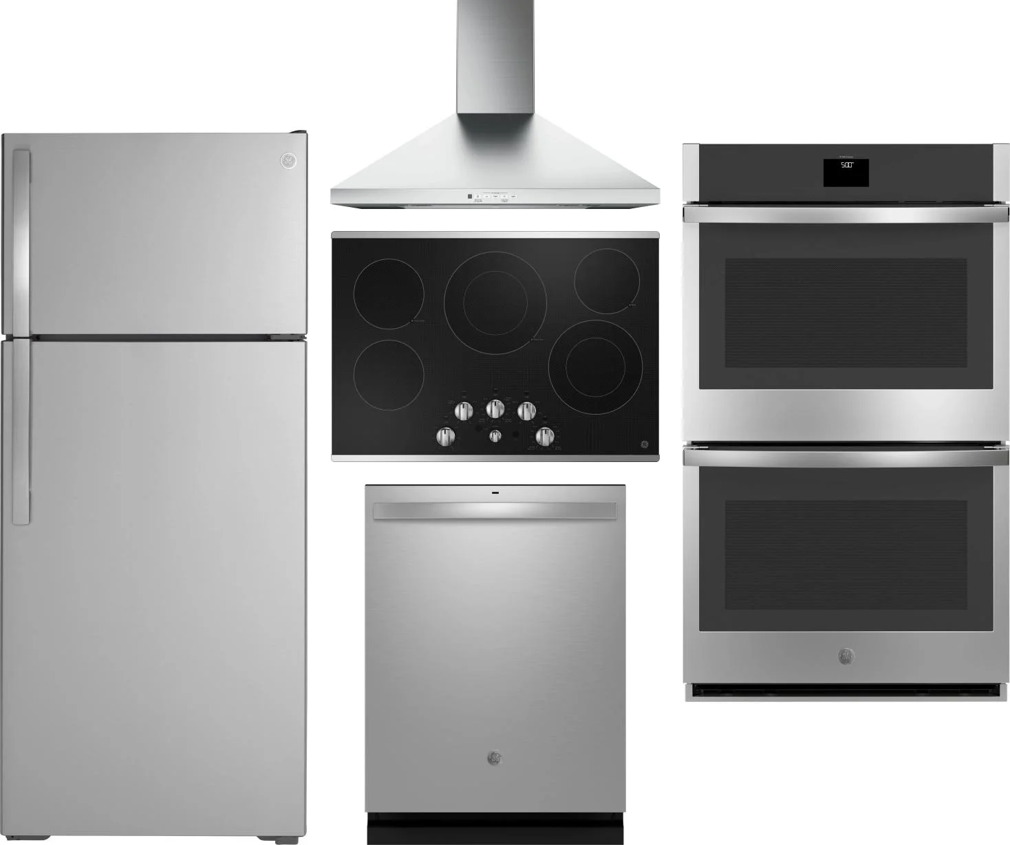 GE 5 Piece Package Includes Refrigerator, Cooktop, Wall Oven, Hood And Dishwasher in Stainless Steel